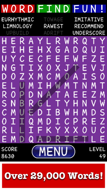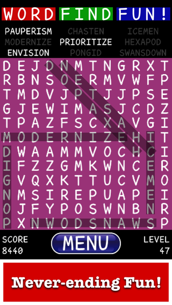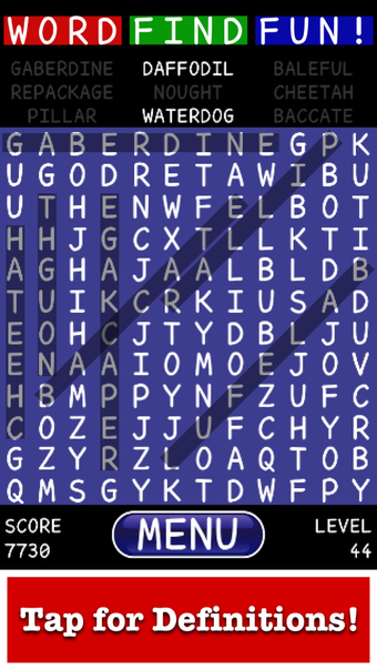 Las características incluyen controles táctiles intuitivos que se ajustan automáticamente, y una barra de palabras que ayuda a los jugadores a seleccionar términos. Con más de 29,000 palabras en su lista incorporada, el juego ofrece un sinfín de rompecabezas de búsqueda de palabras, todos ellos verificados para evitar la aparición de contenido inapropiado. También permite a los jugadores aprender definiciones de palabras al tocarlas, enriqueciendo su vocabulario mientras se divierten.